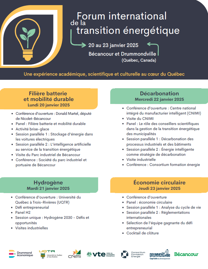 Du 20 au 23 janvier 2025, la première édition du Forum international de la transition énergétique (FITÉ) se déploiera à Bécancour et à Drummondville. Cet événement académique et scientifique réunira une délégation internationale d’étudiants, de chercheurs et de professionnels en provenance du Brésil, de la France, de la Suisse et de l’Allemagne, de même que les principaux acteurs de la transition énergétique de notre région.